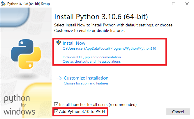 PATHを追加してインストールします。チェックを入れてインストールするとインストーラが自動でPATHを設定してくれます。