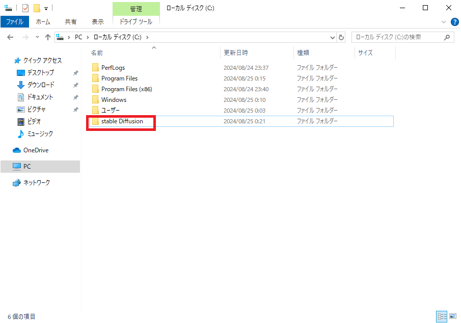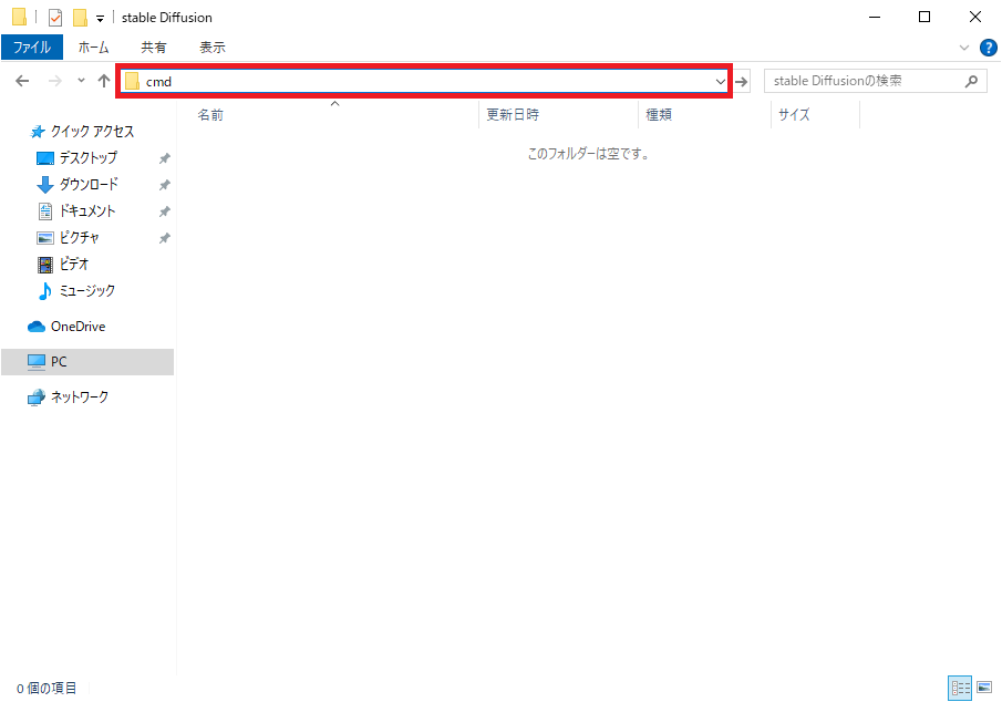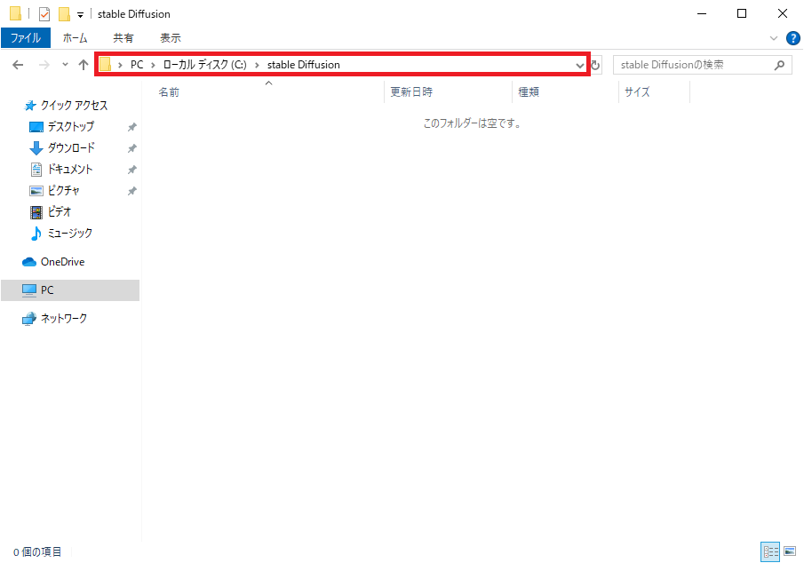 適当なフォルダにStable Diffusion の作業フォルダを作成します。