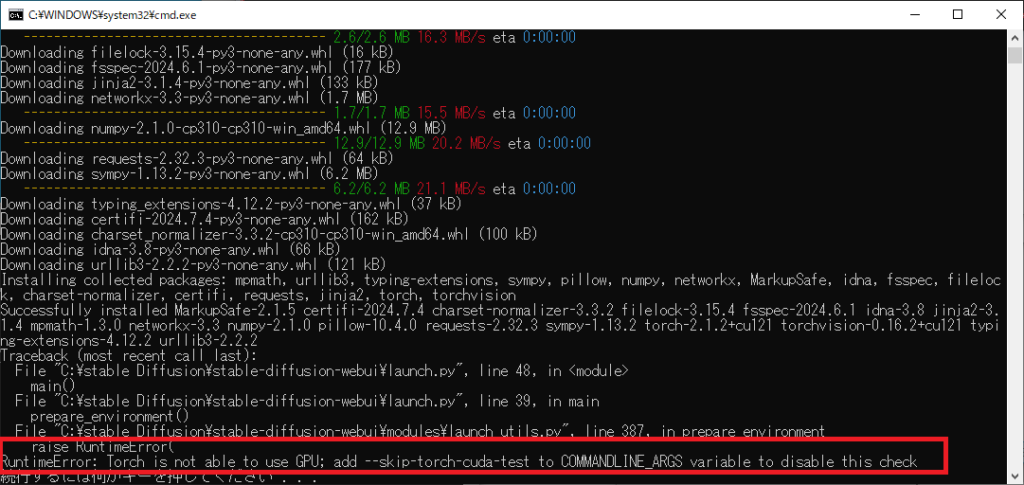 COMMANDLINE_ARGSに–skip-torch-cuda-testを追加するようにとのこと。