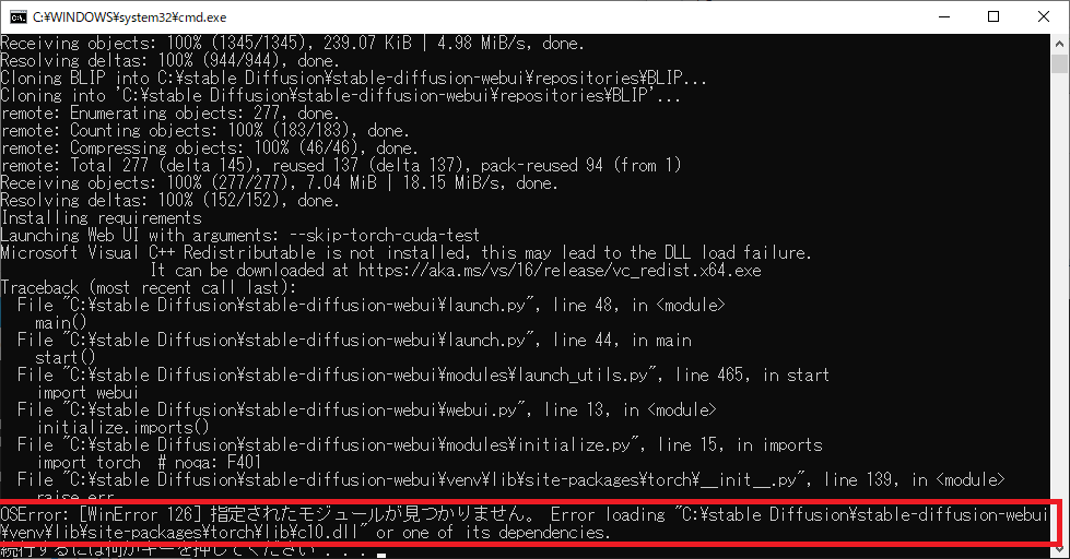 c10.dllが見つからない時はVisual C++をインストールすると解決するとの記事がありました。