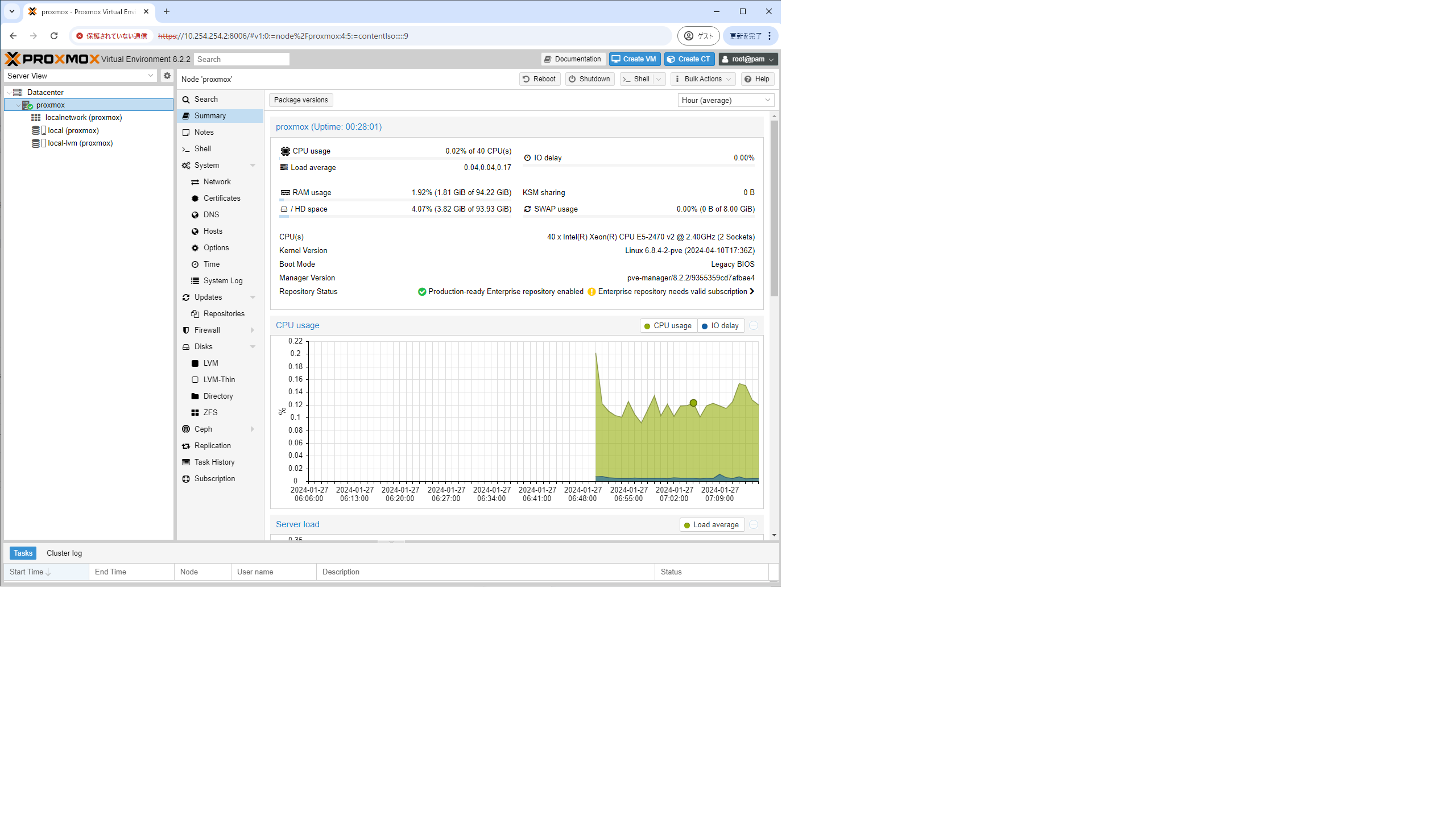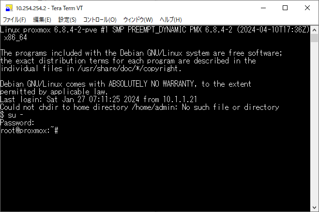 SSHまたはコンソールからProxmoxのShellを開きます。